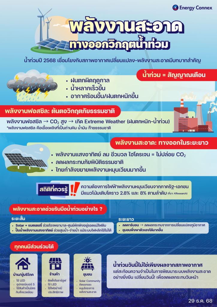 ท่ามกลางเหตุการณ์น้ำท่วมและภัยพิบัติที่มีแนวโน้มรุนแรงขึ้นอย่างต่อเนื่อง พลังงานสะอาดจึงไม่ได้เป็นเพียงภาพของอนาคตที่ยั่งยืน แต่กำลังกลายเป็นกลไกสำคัญในการปรับโครงสร้างพลังงานของประเทศ เพื่อรองรับความเสี่ยงใหม่ และสร้างความพร้อมรับมือกับความท้าทายในระยะยาว