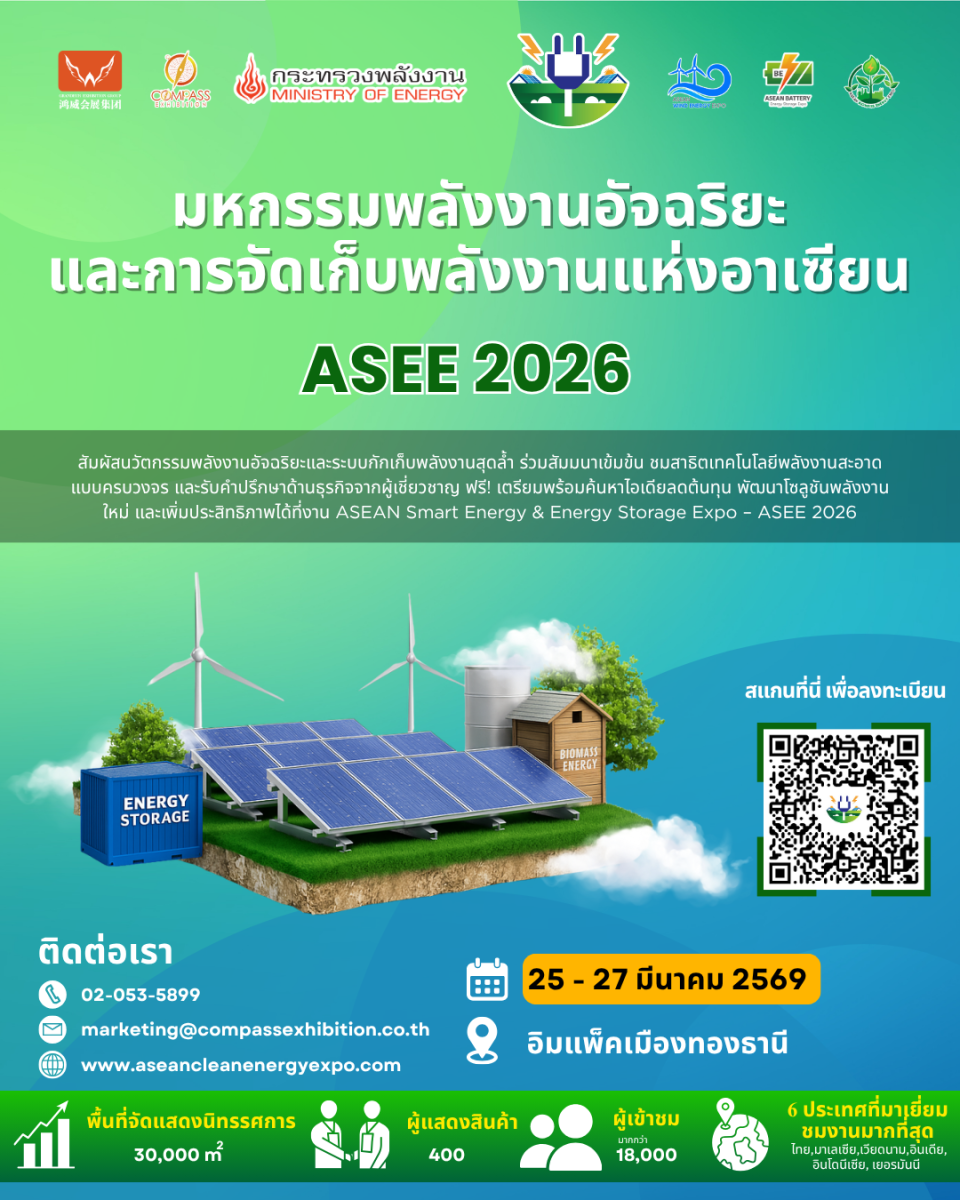 เตรียมพบกับงานมหกรรมพลังงานอัจฉริยะและเทคโนโลยีการจัดเก็บพลังงานที่ใหญ่ที่สุดในอาเซียน! ASEAN Smart Energy & Energy Storage Expo 2026 (ASEE 2026) คือเวทีระดับนานาชาติที่รวมผู้ประกอบการ ผู้นำเทคโนโลยี และนักลงทุนในอุตสาหกรรมพลังงานสะอาดจากทั่วโลกมาพบกันในงานเดียว