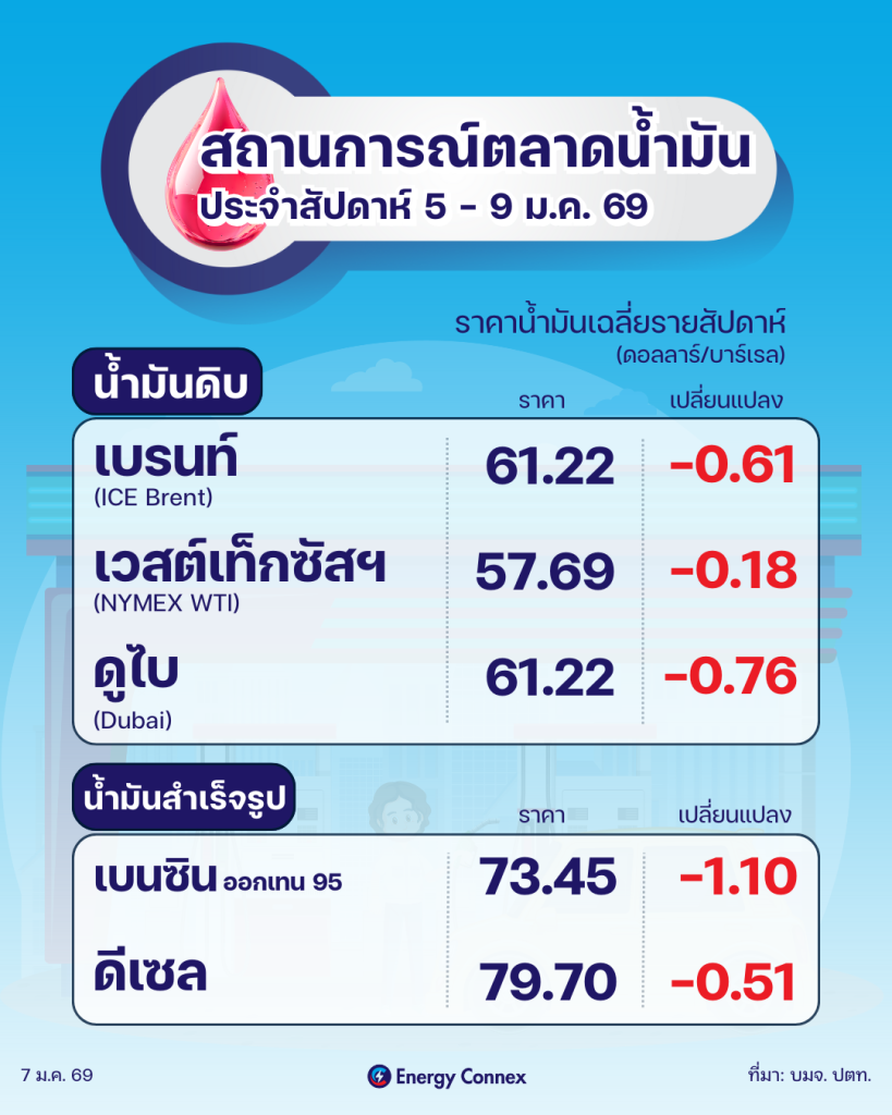 บริษัท ปตท. จำกัด (มหาชน) รายงานสถานการณ์ตลาดน้ำมัน สัปดาห์วันที่ 5–9 ม.ค. 2569 และแนวโน้มสัปดาห์วันที่ 12 – 16 ม.ค. 2569 ตลาดน้ำมันโลกในช่วงดังกล่าวเคลื่อนไหวในทิศทาง ทรงตัวถึงอ่อนตัวเล็กน้อย ท่ามกลางภาวะอุปทานล้นตลาด ขณะที่ปัจจัยภูมิรัฐศาสตร์ยังคงตึงเครียดในหลายภูมิภาค แต่ยังไม่ส่งผลให้เกิดความเสี่ยงด้านอุปทานอย่างมีนัยสำคัญในระยะสั้น
