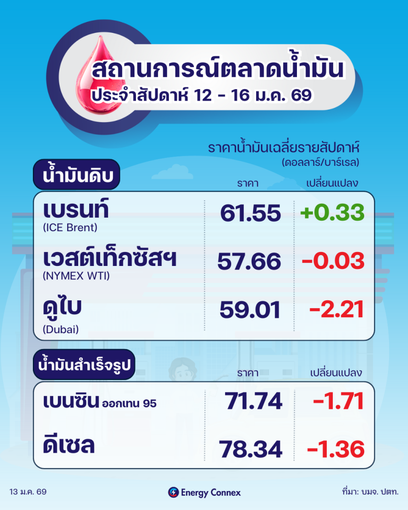 บริษัท ปตท. จำกัด (มหาชน) รายงานสถานการณ์ตลาดน้ำมันโลกประจำสัปดาห์วันที่ 12–16 มกราคม 2569 และแนวโน้มสัปดาห์วันที่ 19–23 มกราคม 2569 พบว่าราคาน้ำมันดิบในตลาดโลกเคลื่อนไหวในทิศทางฟื้นตัว โดยได้รับแรงหนุนจากความตึงเครียดด้านภูมิรัฐศาสตร์ในหลายภูมิภาค ขณะที่ราคาน้ำมันสำเร็จรูปยังเผชิญแรงกดดันจากอุปสงค์ที่ชะลอตัว