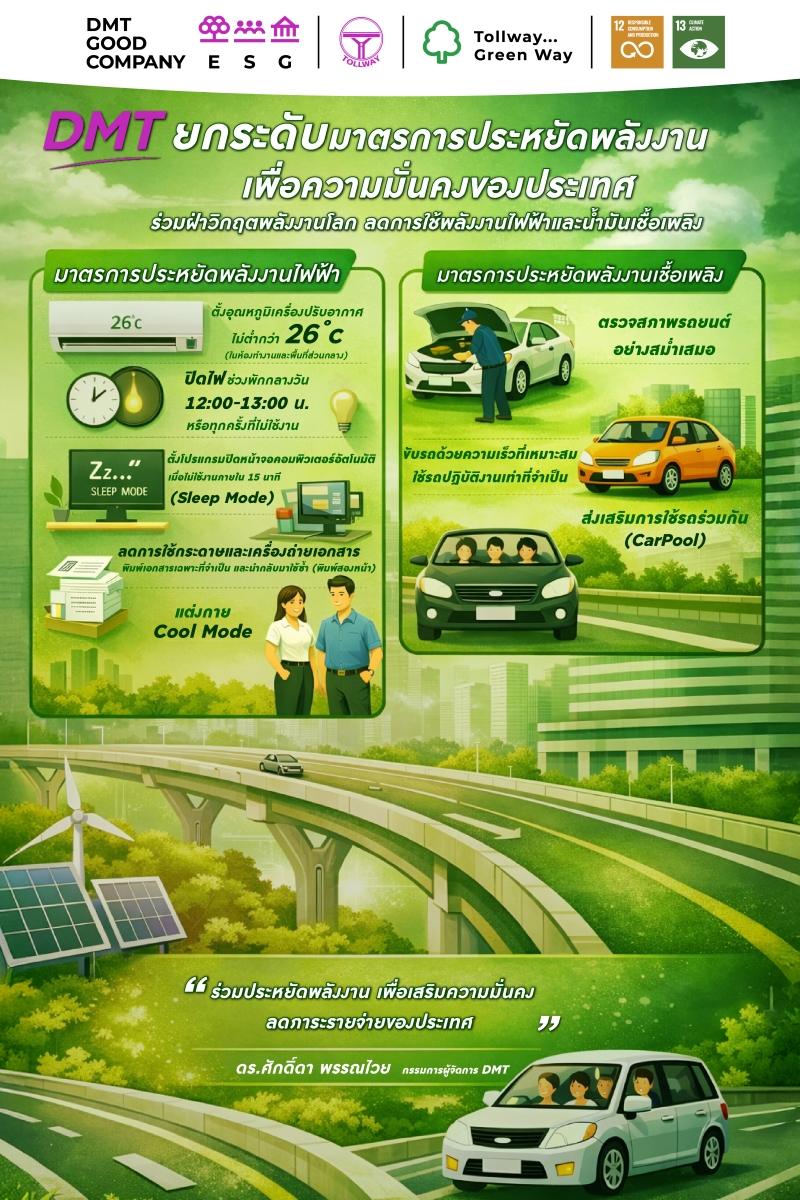 ดร.ศักดิ์ดา พรรณไวย กรรมการผู้จัดการ บริษัท ทางยกระดับดอนเมือง จำกัด (มหาชน) หรือ DMT เปิดเผยว่า จากสถานการณ์ความไม่สงบในภูมิภาคตะวันออกกลาง ซึ่งอาจส่งผลกระทบต่อเสถียรภาพด้านพลังงานโลกและ ประเทศไทย บริษัทฯ จึงได้ยกระดับมาตรการลดการใช้พลังงานไฟฟ้าและน้ำมันเชื้อเพลิง เพื่อสนับสนุนนโยบายของภาครัฐและร่วมลดผลกระทบต่อความมั่นคงทางพลังานของประเทศ